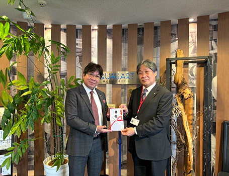 株式会社クオリアート代表取締役社長・櫛田英俊氏から日本赤十字社神奈川県支部 事務局長の河鍋章氏へ目録の贈呈