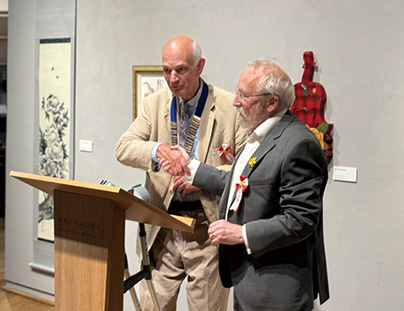 展覧会初日に実施された開会セレモニーには、任期満了に伴い今期で会長をご勇退されるRBA前会長のミック・デイヴィス氏、新会長のマイケル・ハリソン氏をはじめ、多くの日英アーティストがご参集。ミック氏とマイケル氏のそれぞれから、本展とご出展のアーティストへ向けて温かいお言葉を賜り、株式会社クオリアート代表取締役社長 櫛田英俊氏とマイケル氏との間ではサプライズでプレゼントを贈呈し合うなど和やかなムードで式事が行なわれました。